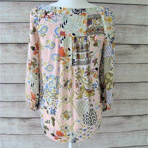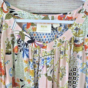 Size 0 bust-38” length-25” 100% viscose Hand wash, line dry. May be dry cleaned Anthropologie Boswell Blouse by MAEVE in pink floral/mixed print. Soft V-neck blouse with 3/4 length balloon sleeves. Pullover styling. Has a slight hi-lo curved hemline. There is one tiny loose thread at v-neck (see pic) #641