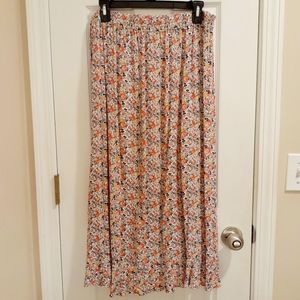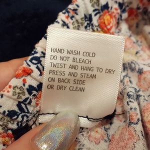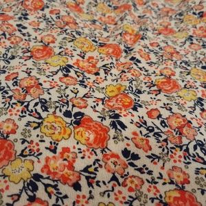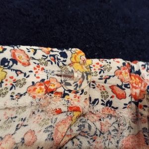 Worn twice, no flaws! Ties at the side and has a button on the inside to keep it secure. Off-white base color with a lovely red, orange, yellow, and navy repeating floral pattern.