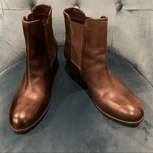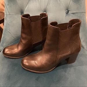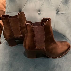 Leather Booties by DIBATrue. Size 8.5. Thick chunky heel. Elastic accents on side allow for flexible fit. Super fun, funky, practical, and on trend. Kick your ensemble up a notch with these contemporary-cool boots, flaunting a stacked block heel that takes your look to new heights. 3'' heel, Slip-on with pull-tab and Cushioned footbed.