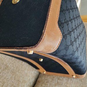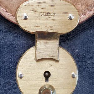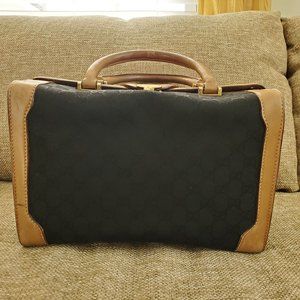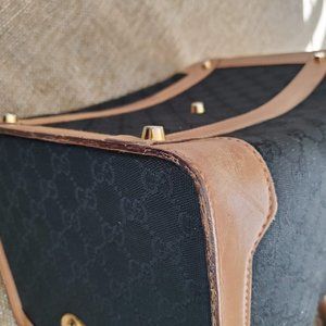 This guaranteed authentic vintage Gucci train case is in fair condition. Black canvas and genuine tan leather material. No serial number from this vintage Gucci era.