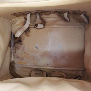 PLEASE READ FLAWS: shows signs of age and use, the shaping issue at the top of the bag causes you to have to put a little effort to close all of the locks, but the locks do close, missing keys, interior is stained, leather shows wear and fading, corners have some wear, canvas has wear.