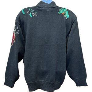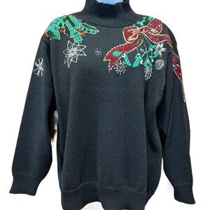 Turtleneck sweater features long sleeves and red embroidered poinsettia motif w/sequins and beads.