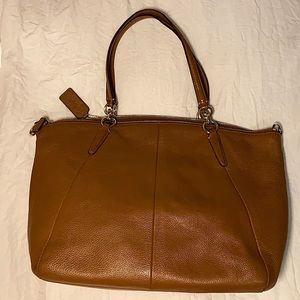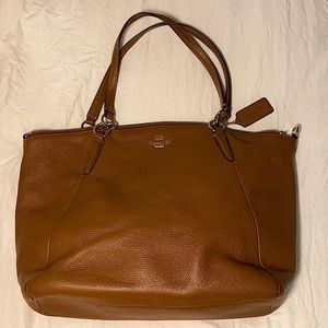 Beautiful warm brown Coach purse. Large size. Excellent condition! Comes with long strap to wear as crossbody. Dimensions: 16 inches wide at top zipper ; 9.5 inches tall at middle