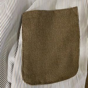 Stafford Men’s Suit Jacket. Measures 31” in length from shoulder to bottom of hem. Chest measures 22” from armpit to armpit laying flat while buttoned. Two button closure on the front. Two front pockets with envelope closure. Four fixed buttons on each sleeve end. One open inside pocket and one buttoned inside pocket. Beautiful brown color. There is no size listed inside so I have included measurements and if anymore is needed please ask. Sleeve length is 25”.