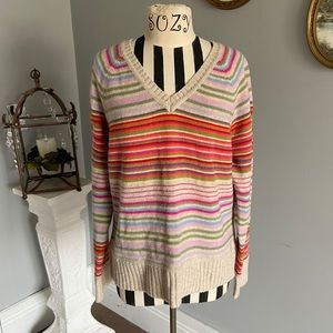 In excellent, preowned condition. Multi colored within cream colored bass, V-neck sweater. Soft wall fabric. Size XL. Please feel free to ask any questions!