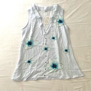 Roxy Oceanside Flared Beach pant. Size M, blue and white floral print pants. Linen viscose blend. Front and back pockets, rope drawstring with a peek-a-boo back and elastic waistband. Waist is 14in laid flat, unstretched. Rise is 9in. Inseam is 30in. Perfect never worn condition, just tags have been removed.