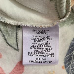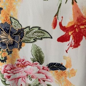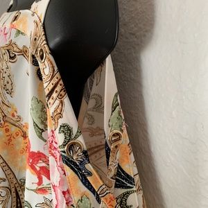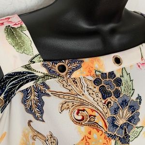 Women’s colorful flowered sexy top w/grommets around front of neck and down the sleeves. Material is threaded through the grommets on the sleeve in the shape of an X. NWOT. Size L.