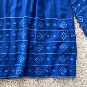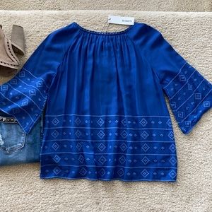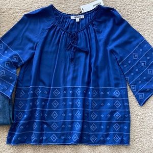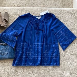 BB Dakota Pelham Blouse in Indigo. 'A tribal design, rendered in tonal embroidery accents the 3/4 sleeves and hemline.' Tassel ties in front. Bell sleeves. Super cute with cutoffs or with skinnies.