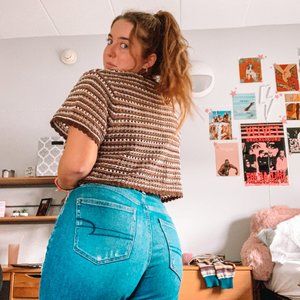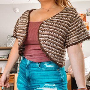 neutral brown toned short sleeve open front knit cardigan, in beautiful condition!