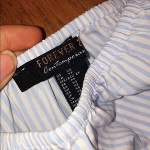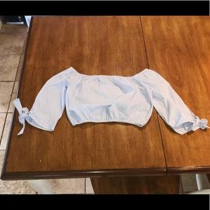 Light white and blue striped off the shoulder top from forever 21. super unique and fun. Tie bows at the ends of the sleeves. Cropped and perfect for flirty and casual looks. Perfect condition. Feel free to ask any further questions!