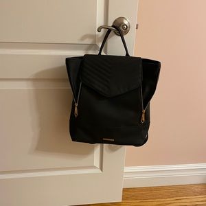 Brand new, never used! fauk black leather backpack. Adjustable straps, magnetic snap to close, one zipper inside pocket, plus two mini inside pockets. Perfect use for work or school!