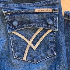 William Rast Dark blue jeans with button back pockets, flared with tie dye at the bottom and holes down the front. Size 26.