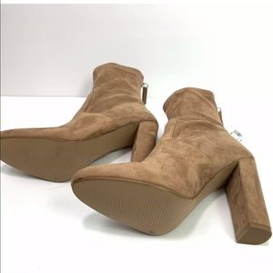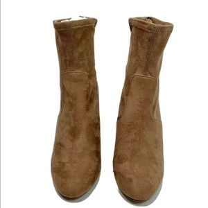 UPC-190640629874 100% Microsuede Imported Synthetic sole Shaft measures approximately 7" from arch Boot opening measures approximately 10" around Suede ankle bootie featuring covered heel and rear zip entry Brand new condition