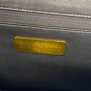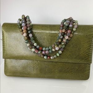 From the Darby Scott necklace collection. Green exotic lizard clutch. Champagne brown leather interior. Handle is five strands of faceted natural multi-color quartz beads. Gold tone interior snap closure. Dual side pockets one with zipper. Gold label “Darby Scott”. Overall great condition- like new.