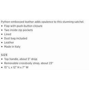 @nysilkenblond hello, the measurements are included in the picks. And yes it’s leather embossed with snake skin finish.