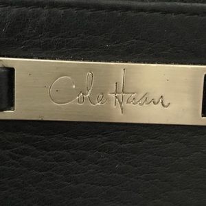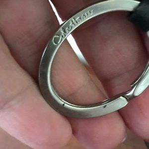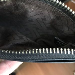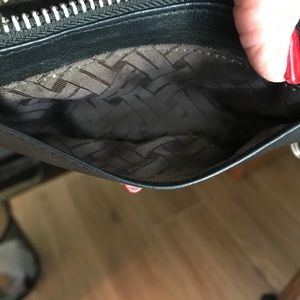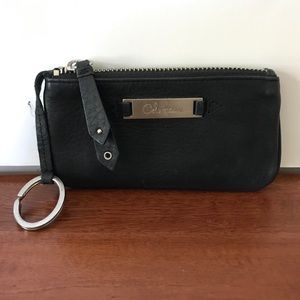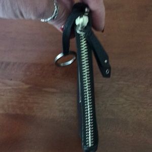 Black soft buttery leather. Brown nylon lining. There is an outside pocket. There is a key ring holder for your keys. Excellent condition. It measures 5 3/4” wide and is 3” tall.