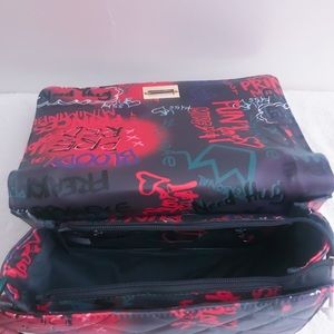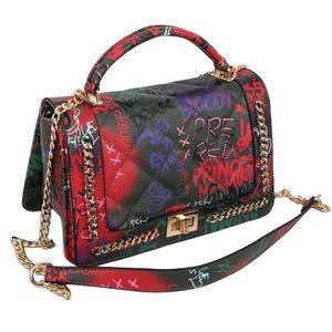 Black and Red Multicolored Quilted vegan leather handbag. Features Graffiti Spray Paint design.