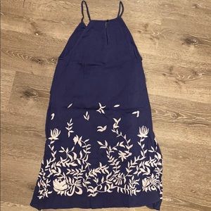 Super comfortable knee length blue dress with white embroidery. Button closure in the back. Has pockets!