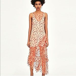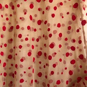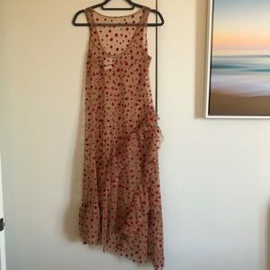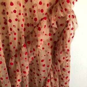Amazing Zara sheer red polka dot dress with ruffled bottom! This dress is so striking in shape and pattern! The red dots are made from a velvet material and the sheer dress is mesh. Does not come with a slip underneath, but you can find one that works for you! Could even wear it over a bathing suit! The only one in Posh! There’s a teeny, tiny tear on a back bottom ruffle (see pic), but you can’t see it when worn. Otherwise amazing condition! Questions/offers welcome!