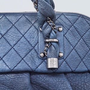Distressed blue diamond quilted pebble leather. Braided straps with silver tone chains. The Silver tone interlocking CC hardware is synonymous with elegance & high French style. Zip closure with logo hang tag. Large zip pocket. 2 slip pockets. Authenticity plaque. Serial numbers 11821876. Minor color wear on exterior & trimming. Moderate ink markings on lining.Overall very good used condition. Polished & ready to wear. Very spacious & will continually set the standard of quality & desirability. Dust bag included