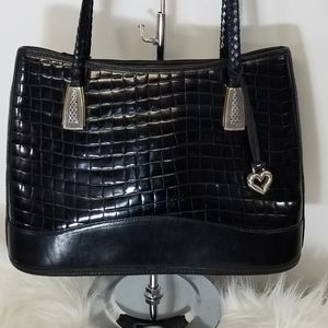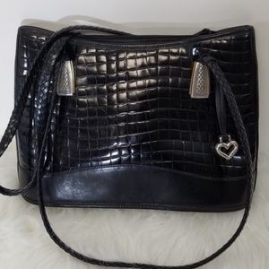 Brighton Bag Large Black Woven Braided Leather with silver and gold tone accents. Gently used in good pre-owned condition with no rips stains or tear. Slight tarnish to metal heart accent, and minor, not noticeable scuffs. Please see all pics and magnify for details.