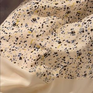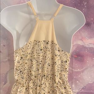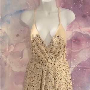 Beautiful light weight deep-V baby doll dress by bcbg with a confetti like print in different shades of blue. The dress has an elastic waist with adjustable straps and an snap in the front for a more modest look. Will