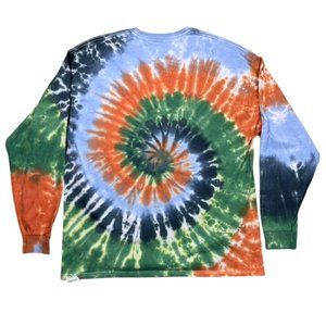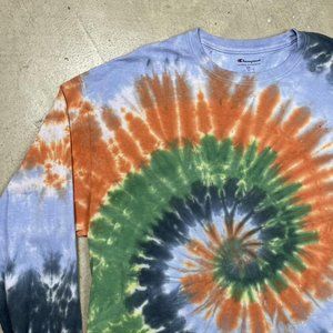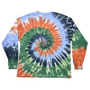 Classic and quality Champion medium weight cotton long sleeve shirt hand dyed by Cesar in blues, green orange & gray tones.