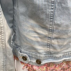 Jou Jou Pin Stipped Denim Side Zip Jacket is adorable & versatile! Constructed in a slightly cropped “trucker” style, wear w/anything- your fave maxi skirt, or white jeans, wear year ‘round. Faded/stone washed denim. Details like brass/antiqued gold buttons. Make this a wardrobe staple. EUC