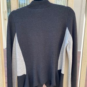 Long sleeve , peplum waist Rachel Roy two tone charcoal grey wool sweater. Light grey insets along waist and inside sleeve ,seam at natural waist ,drops to just above hip.
