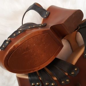 great condition some slight wear see pics light shoes for easy walking and comfort adjustable strap off black and tan 5 Inch Wedge Stacked Heel 1.5 Inch Platform 29