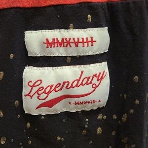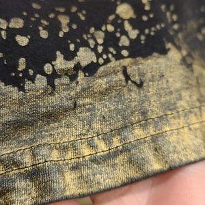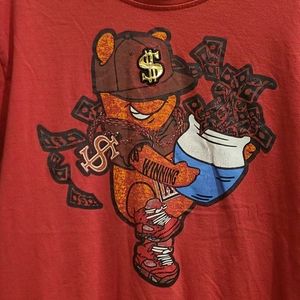 Switch Remarkable Men's Large T-shirt with Pooh Bear on the front. Red with black sleeves, stripe, and hem. Gold paint splatter on black hem.