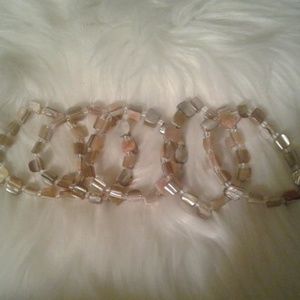 Aren't they pretty! This is a set of five, lovely stretch-bracelets, sized for a young person. (Unless you are petite, and have very small wrists, these will not comfortably fit an adult.) Each bracelet is about 6" around, unstretched. Constructed using polished beads made from natural pearl-shells with clear seed bead spaces, these absolutely shimmer in the sunshine. A little Bohemian, and very cute...perfect for you favorite young miss.