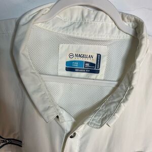 Stay cool and casual in this Magellan White Short Sleeve Button-Front Shirt in size 4XL. Featuring a classic button-down style and a subtle logo detail, this shirt is perfect for everyday wear. Please note: this shirt has a logo as well as a couple of minor flaws — see pictures for details. Comfortable and versatile, it’s a great addition to your wardrobe.