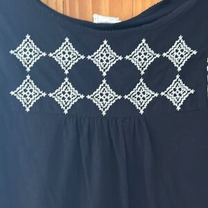 Black with cream embroidery. Cotton and modal. Soft pleats below the embroidery. Approx. armpit to armpit measure is 18 inches. Approx. length is 23 inches.
