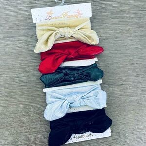 NWT set of 5 metallic stretch baby headbands in Christmas holiday colors. Includes black, silver, gold, green and red.
