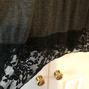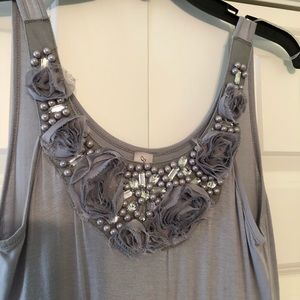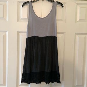Grey sleeveless dress. Top is light grey with beaded and tulle rose detail at bust. Bottom is dark grey with black lace trim.