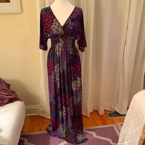 Stylish maxi dress with a bold pattern. Features rich purple and red hues. Perfect for any occasion.