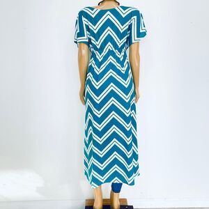 This beautiful Stretch / dress is classy yet comfortable. The chevron print is a tealish green color. The sleeves are flowy giving this dress a fun summer vibe. Pair it with a pair of white wedges for an evening out on the boardwalk.