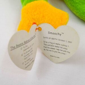 This is a TY Smoochy 5th Generation Tag, Retired Beanie Baby. It has yellow speckling and discoloration on hang tag interior.