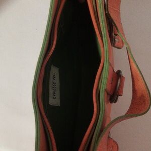 A unique orange with green trimming shoulder pocketbook with inside liner, by the designer by Emily M.