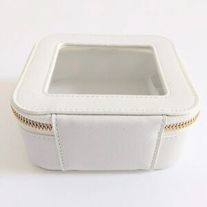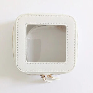 Cream/White approx. 5"x5", clear top, double zip gold hardware top closure makeup/accessory/travel case with attachable wrist strap. 100% PU. Perfect for small & travel size items for your purse or on the go! New w/tag!