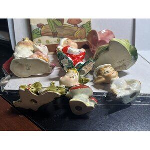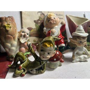 6 1950’s Japan ENESCO? PIXIE ELF FIGURINE Lot CERAMIC ELVES, Gnomes, Vase, 3”-5”