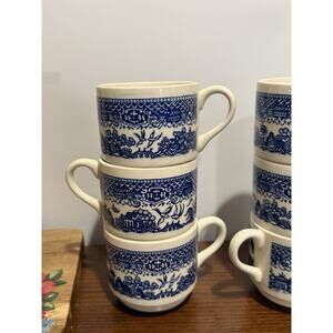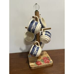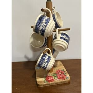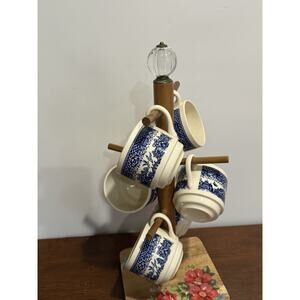 6 Blue willow 6oz. teacup transfer pattern, vintage USA 3" & Wooden Cup Stand