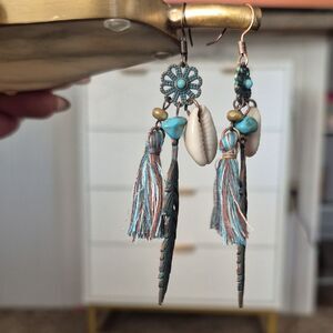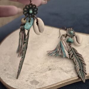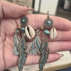Embrace a bohemian vibe with these stunning metal feather earrings with stone, shell amd fringe. Featuring turquoise accents and intricate detailing, they add a touch of elegance to any outfit. 2" to 2.5" long