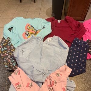 6 matching sets of outfits! 5 Carter’s and 1 Oshkosh. All size 5. Flower and unicorn leggings are fleece lined. Minor fading and pilling from washing