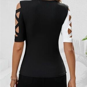 🌞 $6 Cutout Sleeve Black White Contrast Round Neck Asymmetrical Top Sz L (8/10)