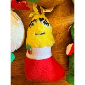 Add some vintage charm to your Christmas tree with these adorable Del Monte Yumkins plush ornaments! This set of 6 includes a variety of fruits and vegetables, all with cute and friendly faces. These ornaments are from 1991 and are in great condition for their age. They are sure to bring a smile to your face every time you see them.