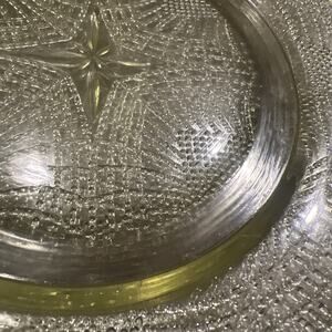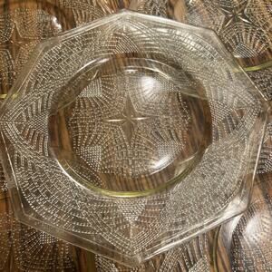 A beautiful set of Romanesque depression glass in pale yellow. This amazing pattern really catches the light and would look beautiful on any table and complement many other patterns and colors of depression glass. No chips or cracks fantastic condition. Each one was photographed individually, please zoom in. They measure 7 1/2 inches from point to point.