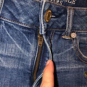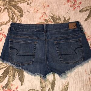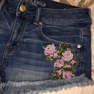 𝑨𝑬 6 Distressed Embroidered Blue Denim Stretch Raw Hem Shorts