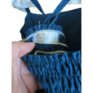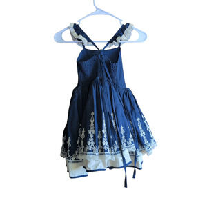 VGUC Dollcake Pretty As A Picture dress. Blue with cream embroidery and lace trim on straps. Cream underskirt with blue trim. Smocked back with adjustable straps. Minimal wear